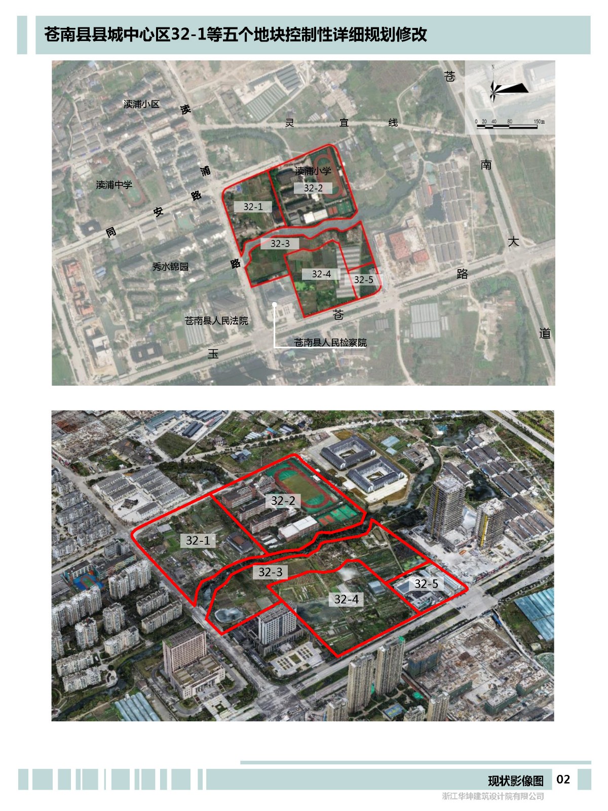 本次规划原控规地块分别为32-1地块(R21,住宅用地)、32-2地块(R22,公共服务设施用地)、32-3地块(G12,街头绿地) 、32-4地块(C1,行政办公用地)、32-5(S2,广场用地),其中32-2地块为现状渎浦小学用地。为提升本次规划修改的可实施性,规划根据《苍南大道两侧(局部)深化城市设计》(2021)地块划分为依据将地块的用地界线进行重新划分。本次规划将地块的用地界限进行重新划分是可行的。