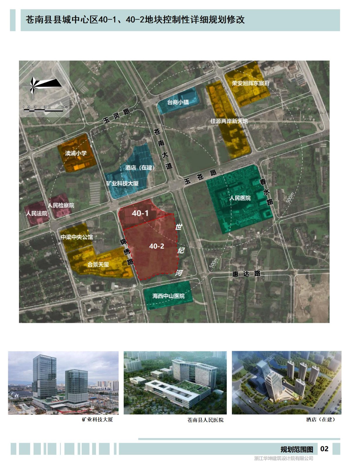 本次规划修改地块位于苍南县县城中心区,原控规40-1、40-2地块东南侧为世纪河,南侧城市道路为规划惠达路,北侧为玉苍路,东侧城市道路为苍南大道,西侧为规划锦绣路。